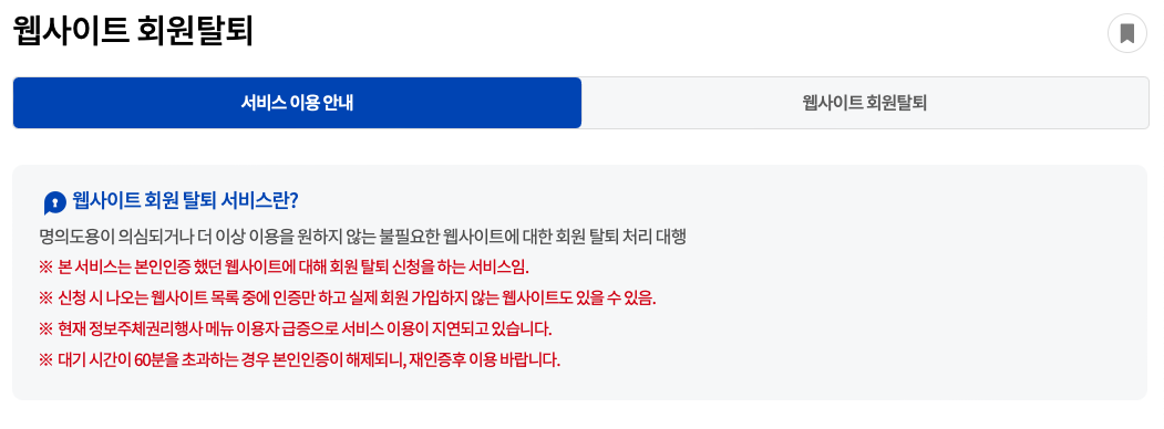웹사이트 회원탈퇴는 명의도용이 의심되거나 더 이상 이용을 원하지 않는 불필요한 웹사이트에 대한 회원 탈퇴 처리를 대행해주는 서비스입니다.