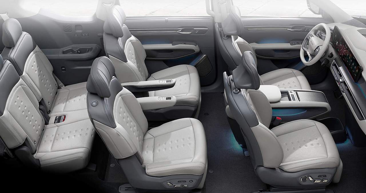 기아 EV9은 넓은 실내 공간과 적재 공간을 자랑합니다. 뒷좌석은 60/40 분할 폴딩이 가능하여 필요에 따라 적재 공간을 확장할 수 있습니다. 기본 트렁크 용량은 560리터이며, 뒷좌석을 접으면 최대 1,740리터까지 확장됩니다. 다양한 수납 공간과 USB 포트도 제공됩니다.