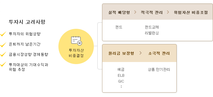 A. 원리금 보장 상품도 선택할 수 있습니다. 예금, 보험 등 안전자산을 활용하거나, TDF 상품으로 전문적인 운용을 맡기는 방법도 있어요.